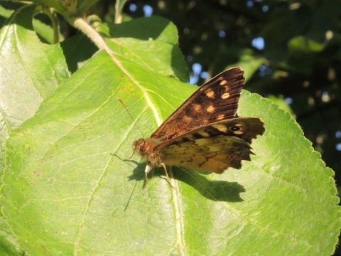 Heruntergefalle Birnen haben wir besser liegen lassen, sie faulen sehr schnell. Und es gibt bei uns neben den Vögeln auch reichlich Insekten, die sich an Ihnen vergnügen, wie z. B. Gewöhnliche und Deutsche Wespen, Feldwespen, Hornissen sowie Ameisen und Fruchtfliegen. Ein typischer Schmetterling von Obstwiesen ist das Waldbrettspiel, das in Bochum nicht mehr so häufig zu beobachten ist. Der Schmetterling ernährt sich weniger von Blütennektar, sondern saugt an Baumsäften und reifem Obst