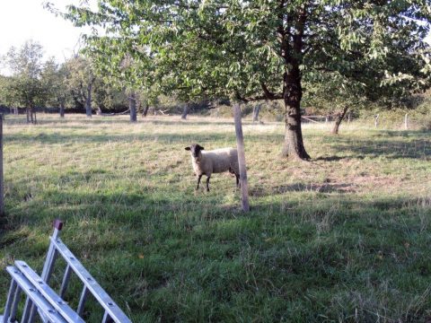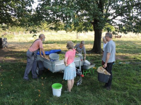 Nach der Arbeit also traf sich ein von Mathias zusammengetrommeltes Grüppchen aus etwa zehn eifrigen Personen und erntete mit Leiter und Obstpflücker. Es gibt ganz verschiedene Birnensorten auf der Wiese, die Mathias über die Jahre hat bestimmen lassen. Einige sind schon überreif, während andere noch ein bisschen brauchen. Der Geschmack ist ganz unterschiedlich und nicht die Bestaussehenden sind unbedingt die Leckersten. Schnell wurde ein ganzer Anhänger vollgemacht, neugierig beobachtet von den Schafen. Die Ernte erfolgt wegen des warmen Sommers früher als sonst, aber auch im Oktober gibt es noch einiges zu ernten.