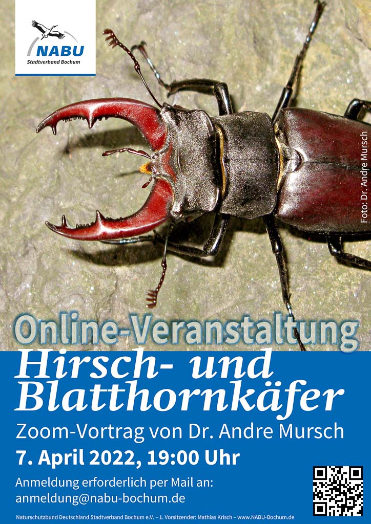 Unter den Hirschkäfern und den nahe verwandten Blatthornkäfern finden sich einige der größten Insekten Mitteleuropas und manche ihrer tropischen Vertreter gehören sogar zu den größten heute lebenden Insekten weltweit. Viele einheimische Arten sind gefährdet. Dr. Andre Mursch ist wissenschaftlicher Mitarbeiter am Lehrstuhl für Evolutionsökologie und Biodiversität der Tiere der Ruhr-Universität Bochum. Sein Vortrag stellt die Lebensweise ausgewählter einheimischer und exotischer Arten vor.