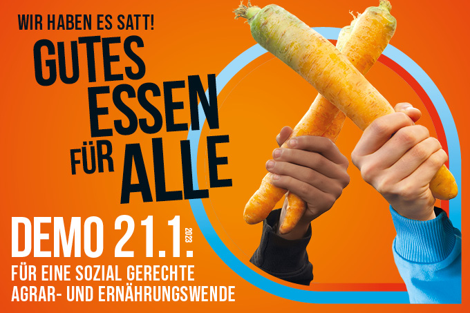„Gutes Essen für alle – statt Profite für wenige!“ lautet das Motto der Demonstration, bei der am Samstag zum Auftakt der Grünen Woche wieder viele Tausende auf die Straße gehen. Nach zwei Jahren pandemiebedingt kleinerer Aktionen demonstrieren Bäuer*innen, Imker*innen, Bäcker*innen gemeinsam mit Konsument*innen für eine bäuerliche Landwirtschaft, artgerechte Tierhaltung, Artenvielfalt, konsequenten Klimaschutz, gentechnikfreie Lebensmittel und eine Beendigung des globalen Hungers.