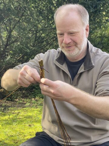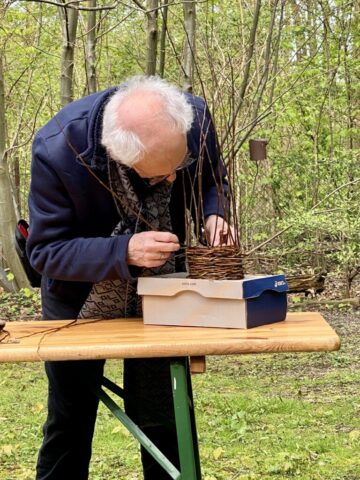 Bei Sonnenschein und frühlingshaften Temperaturen begann Bernd Steinke – sich selbst als Hobbyflechter bezeichnend – die Außenveranstaltung mit einer kurzen Einführung über Größe und Vorbehandlung der Weidenzweige, damit das Flechtprodukt gelingt und auch später seine Form und Stabilität behält.