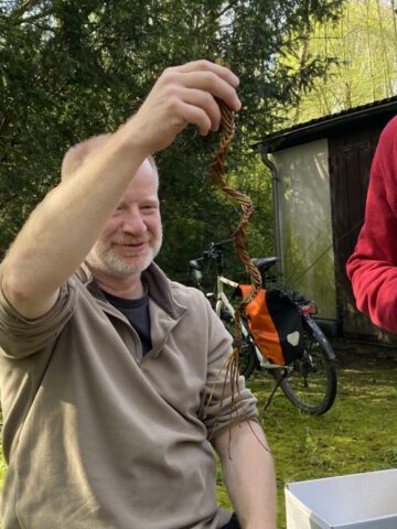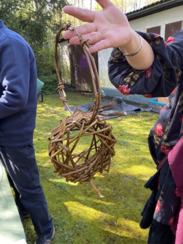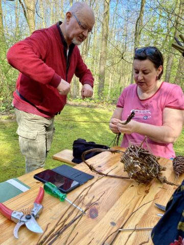 In Praxisteil II war eine deutliche Steigerung der motorischen Fähigkeiten gefragt: Es galt ein Weidenkörbchen für Meisenknödel mit Aufhängevorrichtung zu basteln. Gar nicht so einfach, aber mit Tipps und Hilfestellungen von Bernd, gegenseitiger Unterstützung der Teilnehmer und viel Humor waren am Ende alle zufrieden mit ihren fertiggestellten Produkten. „Danke Bernd; das hat ganz viel Spaß gemacht!“, darin waren sich am Ende alle einig.