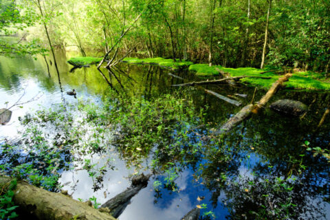 Das Sumpf-Blutauge (Comarum palustre) wächst bevorzugt im Randbereich von Hochmooren und auf schlammigen, offenen Böden von Niedermooren, aber es kommt auch in nährstoffarmen Gräben sowie am Ufer stehender oder langsam fließender Gewässer vor. Von Mai bis August zieht seine auffällig purpurne, braune bis blutrote Färbung dort nicht nur unsere Blicke auf sich. Eine Vielzahl an Insekten, vor allem Wildbienen wie Baum-, Stein und Ackerhummeln sowie Fliegen, werden von ihr angelockt und für den Besuch mit zuckerreichem Nektar und Pollen belohnt. Das Sumpf-Blutauge gehört zur Familie der Rosengewächse, zu welcher nicht nur die namensgebenden Rosen, sondern auch viele Obstsorten wie Apfel oder Erdbeere zugeordnet werden. Stacheln oder essbare Früchte sind bei der Blume des Jahres aber nicht zu finden. Seine 20 bis 70 cm langen Stängel sind oft flaumig bis zottig behaart, die Blätter bestehen aus 3-5 unpaarig zusammengesetzten Blattfiedern. Während die Früchte heranreifen, erinnert die aufgequollene Blütenachse tatsächlich an eine Erdbeere. Es werden etwa 1,5 mm große Nüsse ausgebildet, die dank ihrer Hakenspitze zum Beispiel im Gefieder von Wasservögeln hängenbleiben und fortgetragen werden. Die Samen sind erstklassige Schwimmer und können bis zu 12 Monate an der Wasseroberfläche treiben, bis sie an einem neuen Wuchsort angeschwemmt werden. Das Sumpf-Blutauge breitet sich zudem über Erdsprosse aus. Diese sogenannten Rhizome werden bis zu einem Meter lang und wachsen untergetaucht im Wasser oder mit Vorliebe durch offenen, schlammigen Boden.