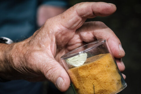 So konnten auf dem ersten Anstieg gleich mehrere Exemplare des Waldbrettspiels beim Sonnenbad ausgiebig beobachtet und fotografiert werden – mehrfach unterbrochen von akrobatischen Flugmanövern bei Streitigkeiten an den Reviergrenzen. Gleich darauf Sichtung eines Grünader-Kohlweißlings, von Wulf Jaedicke fachgerecht eingefangen und im Sichtglas zur Nahbetrachtung präsentiert.