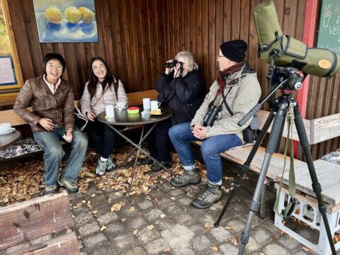 Nach 2 Stunden an der Bude 128 angelangt, war der Endpunkt der Exkursion erreicht und ein leichter Nieselregen setzte ein. Ulrich bedankte sich bei den Teilnehmer*innen für ihr Interesse und die meisten begaben sich zufrieden (vor allem mit 4 Eisvogelsichtungen!) auf den Rückweg; nur eine kleine Gruppe genoss noch den leckeren Kaffee und Mandelkuchen an der Bude 128 und hatte Spaß.