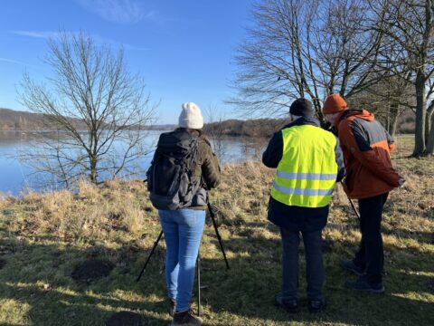 Windstille und drei Spektive ermöglichten auch Teilnehmer*innen ohne Fernglas eine gute Sicht vor allem auf die Wasservogelarten, die sich auf dem See tummelten. Dabei wurden artspezifische Merkmale sowie Unterschiede zwischen Männchen und Weibchen im Federkleid deutlich. Stock-, Pfeif-, Schnatter-, Tafel- und Schellenten, Zwerg- und Gänsesäger , Hauben- und Zwergtaucher waren neben einem Silberreiher die Vogelarten, die das meiste Interesse der Teilnehmer*innen weckten.
